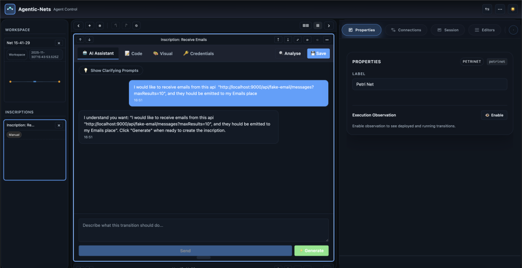 - Input place gets tasks like “create a net that checks inbox, summarizes new emails, and posts a daily digest”.