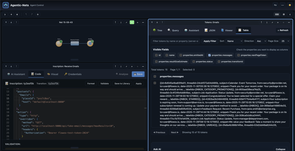 - Testing & Simulation Phase – Run nets with test data, watch tokens move, verify that AGENT/LLM transitions produce correct deterministic calls behind them.