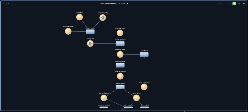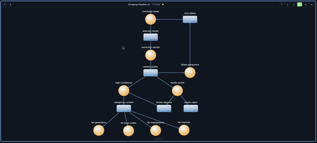I was sitting at my desk, staring at a complex web scraping pipeline that needed to extract generator specifications from websites, deduplicate entries, execute extraction via Claude, assess quality, and route results based on confidence scores. Traditional development would have taken days of coding, testing, debugging, and refactoring.