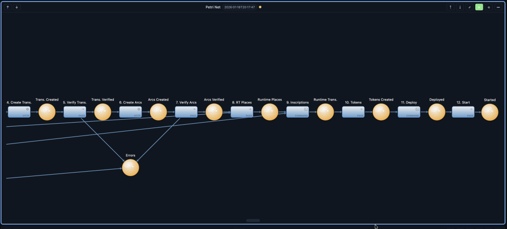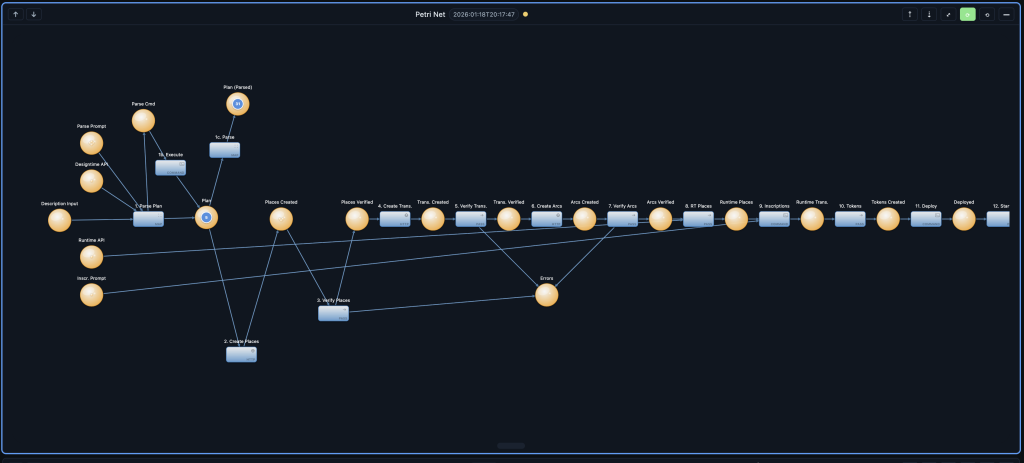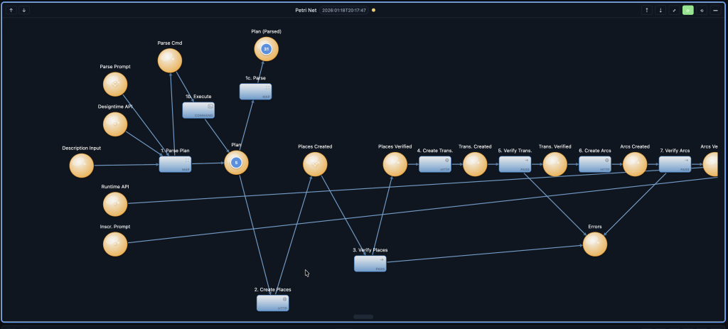 What if you could describe an agentic process in plain English, and an AI would not only understand it but build the entire executable infrastructure? Not just generate some code – actually create places, transitions, connections, runtime configurations, and start the whole thing running?