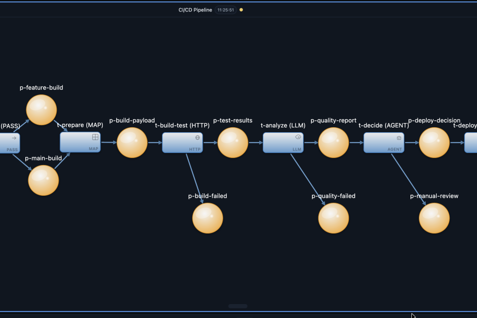 CI/CD Pipeline – A Complete Agentic Net Example with Error Handling This guide demonstrates a real-world CI/CD Pipeline built as an Agentic Net. Unlike the simple linear showcase, this example includes error paths, conditional routing, and multiple postsets – showing